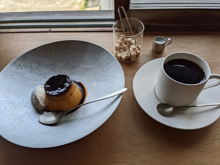 注文と支払いは先に済ませ席に着くシステムで自家製プリンとブレンドコーヒー
