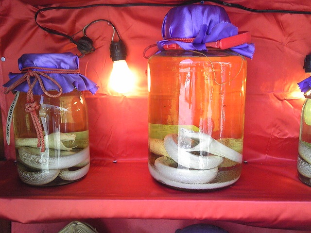 途中スコール的な雨に遭いながらお土産屋さんをブラブラ。酒屋の店先にはハブ酒も