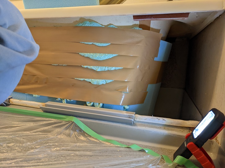 板厚20mmで貼り付け、接着と隙間埋めに発泡ウレタンを噴きました