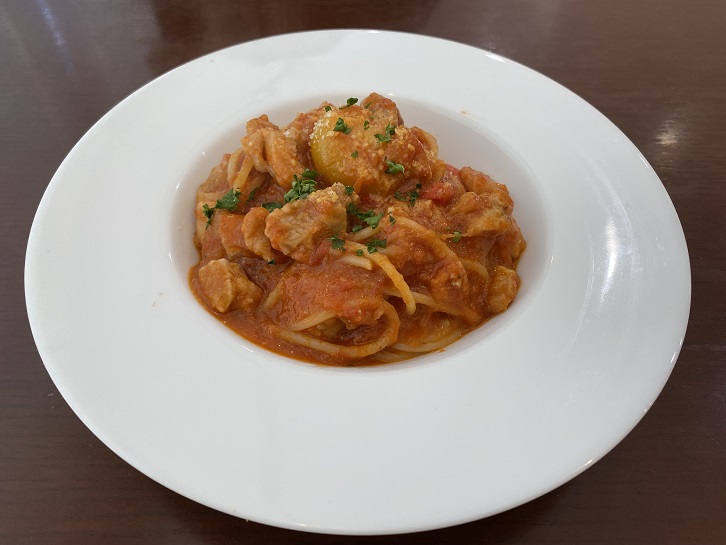 鶏肉とパプリカの煮込みトマトソーススパゲッティ