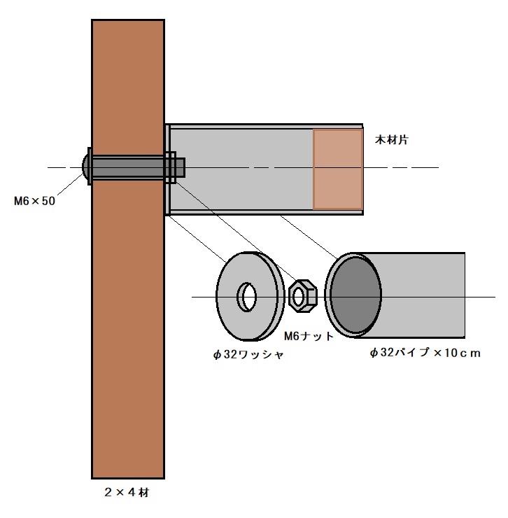 スチールパイプがあったので長さ10cmで切り直径32ミリのワッシャとM6ナットを