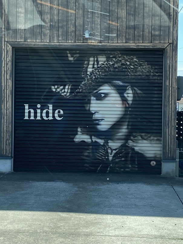 愛媛方面へ曲がったらすぐ道路左側の建物のシャッターにXJAPANのHIDEが