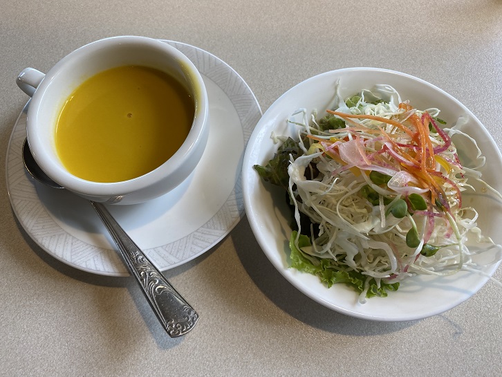 奥さんのランチのかぼちゃスープとサラダ