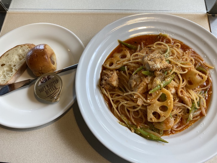 メインのランチパスタはチキンと蓮根のトマトソース