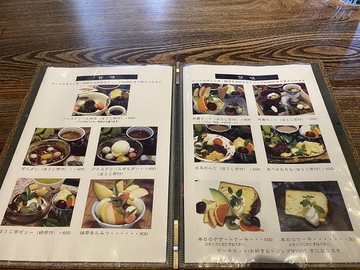 メニューにはぜんざいやあんみつなどほうじ茶付きのセットがたくさんあります