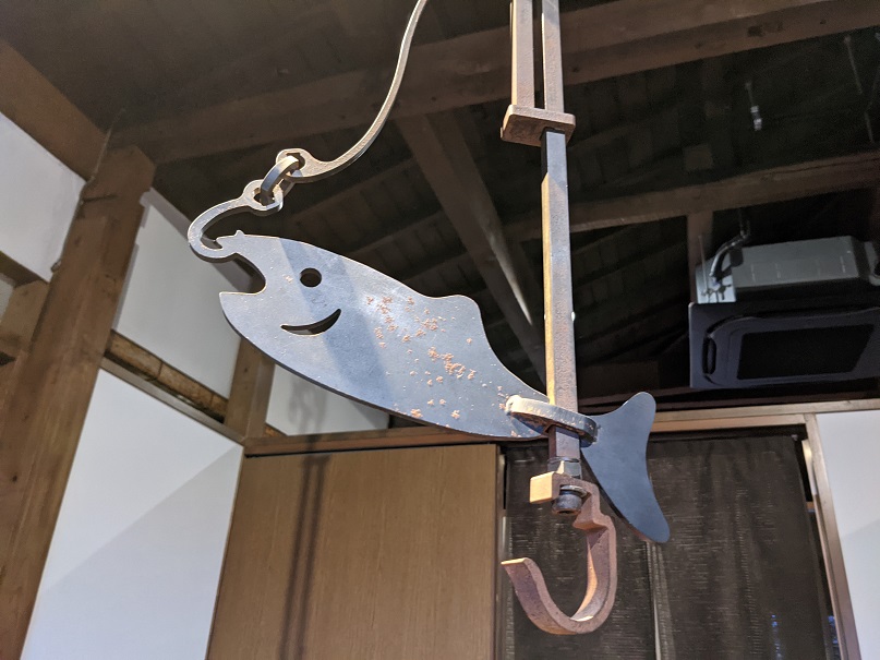 囲炉裏の上の鍋をかけるところには釣り針のかかったお魚がデザインされてます