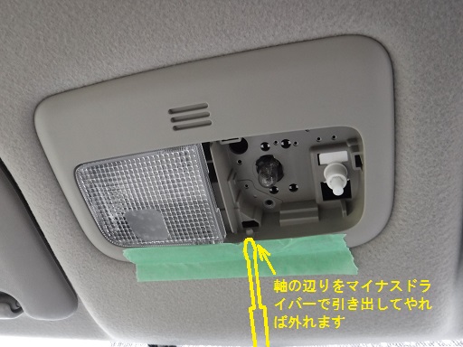 まずは前席の頭上にあるマップランプへ手持ちのLEDを・・
