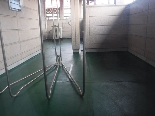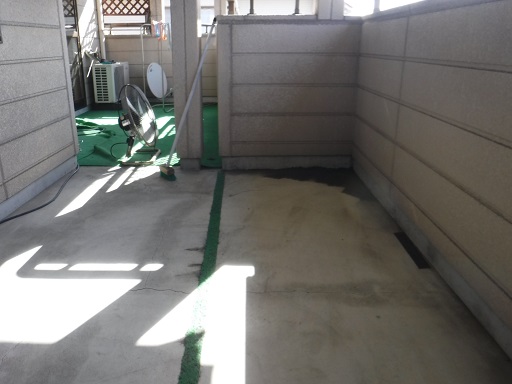 まずは劣化したベランダの人工芝の撤去と床のひび割れの補修と塗装