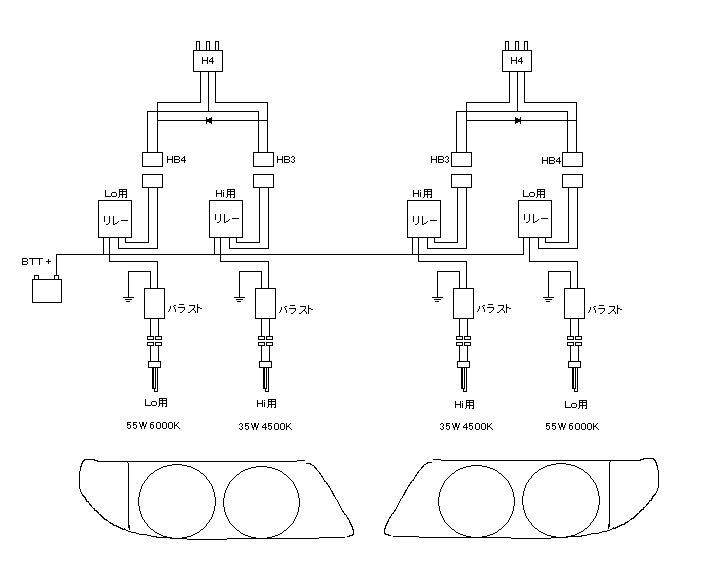 一応配線図はこんな感じ。(H4のHi-Lo分岐では6Aダイオードを使用し4灯同時点灯化としてます)